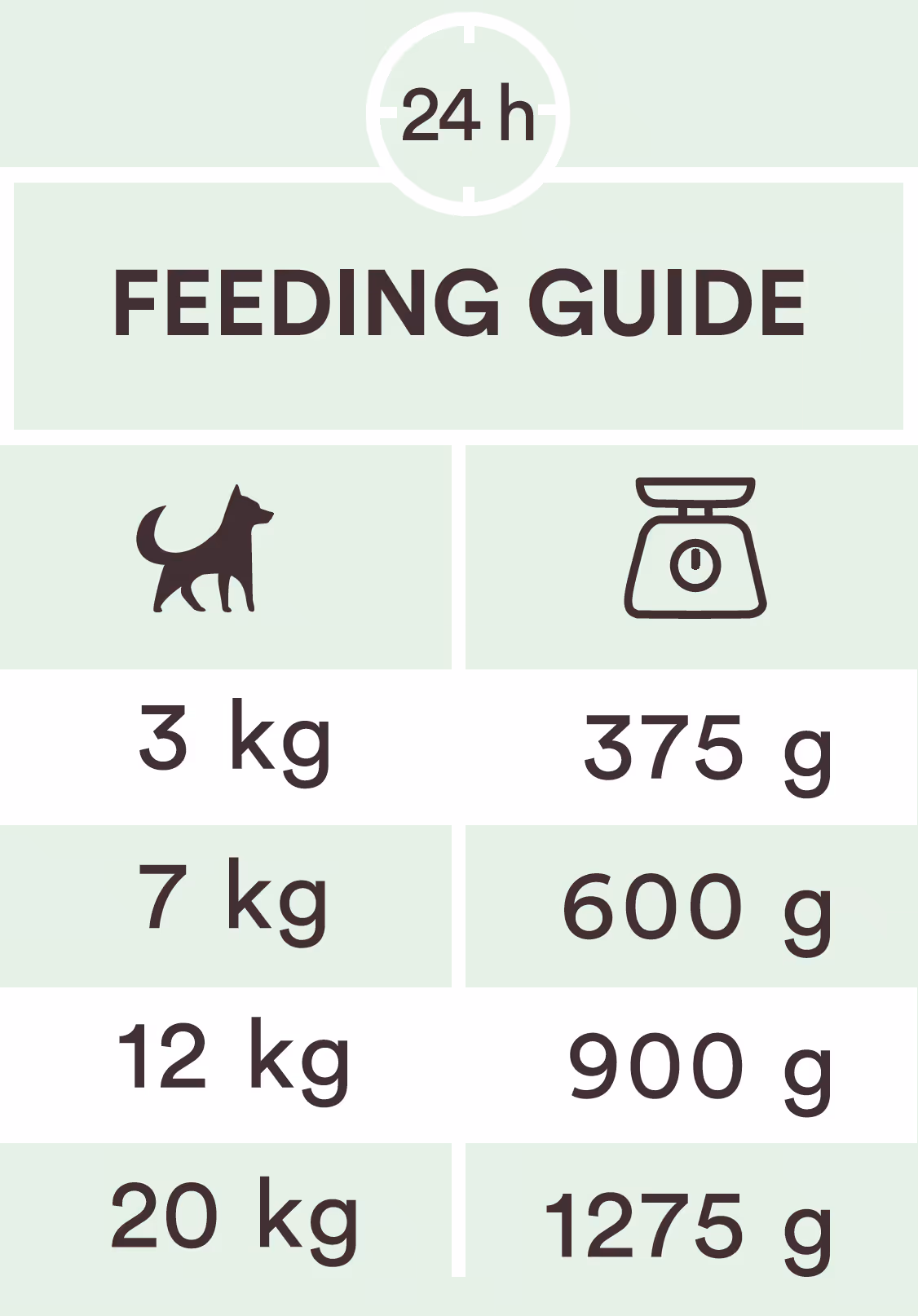 Mængden foder du skal give din hund er afhængig af dens alder, behov och aktivitets- niveau. Den skal altid have tilgang til friskt vand. Foderet skal opbevares tørt og stuetempereret. Åbnet forpakning skal opbevares i køleskab højst 2 dage. Gives stuetempereret. Bedst-før-dato og batch; se siden af pakken.